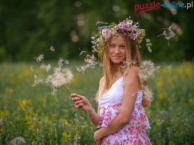 Twarz, Kwiaty, Wianek, Łąka, Kobieta, Włosy, Mniszek