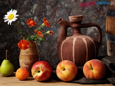 Kwiaty, Beczka, Owoce, Wazon, Dzban