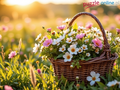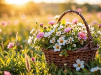 Koszyk, Białe, Różowe, Kwiaty, Trawa, Wiklinowy