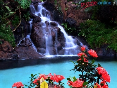 Puzzle Kwiaty, Wodospad, Woda, Drzewa