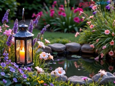 Ogród, Oczko wodne, Kwiaty, Lampion, Grafika AI