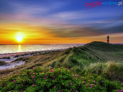 Latarnia morska, Wyspa Sylt, Zachód słońca, Niemcy, Morze Pólnocne, Kwiaty
