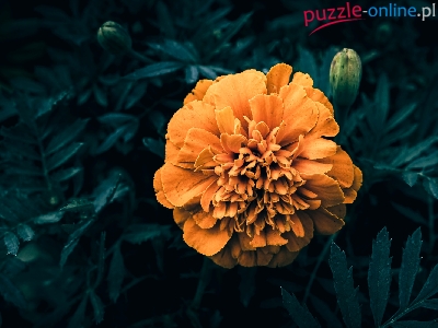 Puzzle Liście, Kwitnąca, Aksamitka, Ciemne tło
