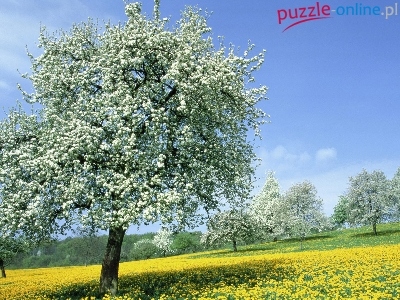 Puzzle Kwitnące, Wiosna, Łąka, Drzewa