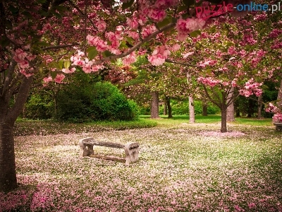 Kwitnące, Wiosna, Park, Ławki, Drzewa