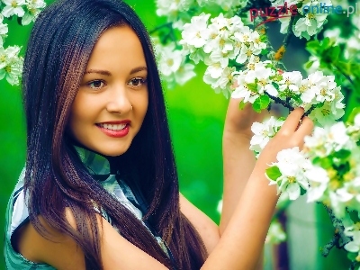 Kwitnące, Dziewczyna, Wiosna, Uśmiechnięta, Brunetka, Drzewo