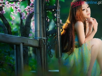 Puzzle Kwitnące, Zamyślona, Kobieta, Drzewo