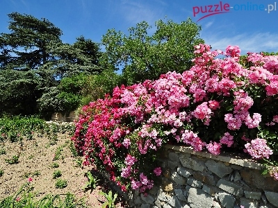 Kwitnące, Drzewa, Różane, Ogród, Murek, Krzewy