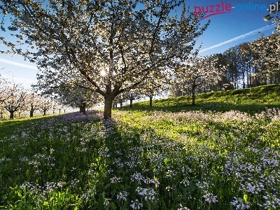 Kwitnące, Promienie słońca, Wiosna, Sad, Drzewa