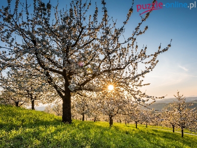 Trawa, Wzgórze, Wiosna, Kwitnące, Poranek, Drzewa owocowe