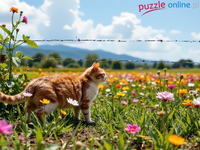 Puzzle Ogrodzenie, Rudy, Kot, Łąka