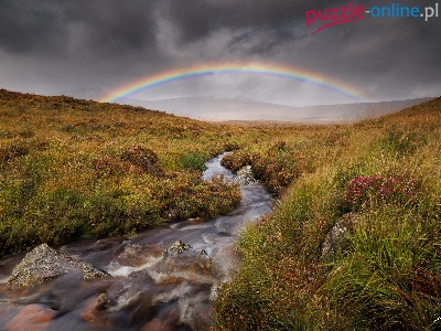Kamienie, Góry, Rzeka, Łąka, Chmury, Tęcza, Trawa