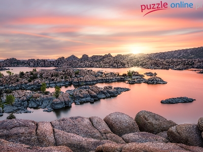 Arizona, Stany Zjednoczone, Zachód słońca, Watson Lake, Chmury, Kamienie, Jezioro, Skały