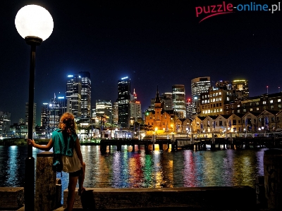 Miasto, Sydney, Chmur, Rzeka, Kobieta, Drapacze, Australia, Noc, Lampa