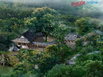 Puzzle Las, Domki, Chiny, Staw