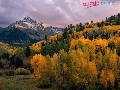 Góry, Kolorado, Stany Zjednoczone, Mount Sneffels, Las, Chmury, Niebo, Jesień, Drzewa