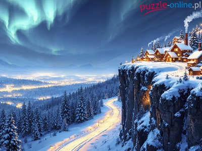 Droga, Zima, Dolina, Zorza polarna, Domy, Skały, Las