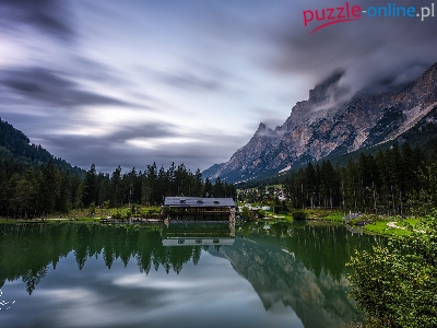 Lago Mosigo, Prowincja Belluno, Włochy, Góry, Las, Domy, Odbicie, Jezioro, Drzewa