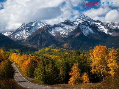 Drzewa, Góry, Jesień, Las, Chmury, Droga