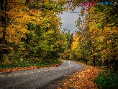 Las, Zakręt, Jesień, Drzewa, Droga