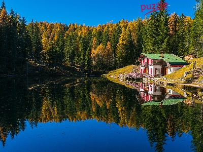 Odbicie, Dom, Staw, Las, Jesień, Drzewa