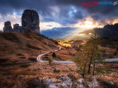Wschód słońca, Góry, Chmury, Włochy, Drzewa, Dolomity, Skały, Jesień, Las, Cinque Torri