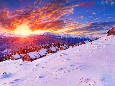 Las, Słońca, Zima, Zachód, Góry, Domki