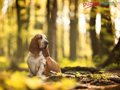 Las, Łączka, Pies, Basset hound, Drzewa