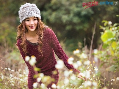 Las, Kwiaty, Młoda, Japoneczka, Polana