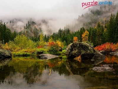 Las, Kamienie, Jesień, Jezioro, Mgła