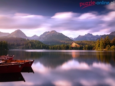 Las, Słowacja, Łódki, Jezioro, Chmury