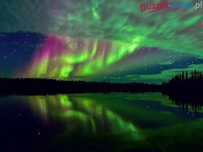 Puzzle Las, Zorza Polarna, Jezioro, Gwiazdy