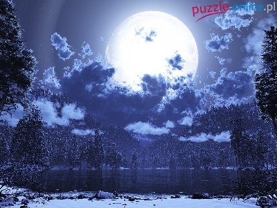 Las, Księżyc, Zima, Jezioro, Chmury