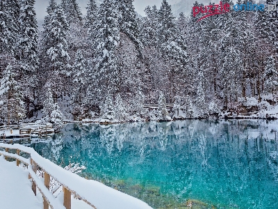 Las, Åšnieg, Zima, Jezioro, Ogrodzenie