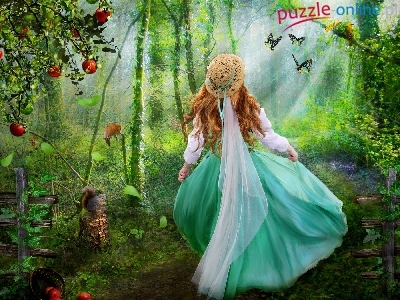 Puzzle Las, Dziewczyna, Kapelusz, Promienie
