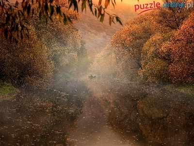 Las, Rzeka, Postać, Jesień, Mgła, Łódka