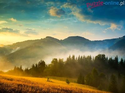 Las, Wschód słońca, Góry, Mgła, Chmury