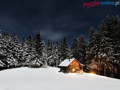 Las, Dom, Zima, Noc, Oświetlony