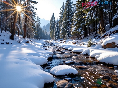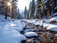 Las, Zima, Drzewa, Grafika AI, Rzeka, Potok, Promienie słońca