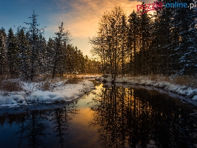Las, Drzew, Zima, Rzeka, Odbicie