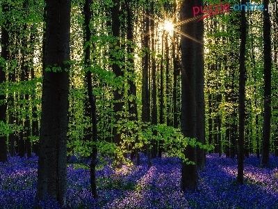 Hiacyntowiec, Las Hallerbos, Drzewa, Belgia, Kwiaty, Promienie słońca