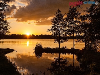 Puzzle Las, Jezioro, Zachód słońca, Drzewa