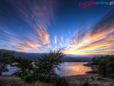 Puzzle Las, Rzeka, Zachód Słońca