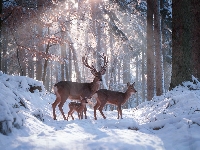 Jeleń, Śnieg, Zima, Las, Przebijające światło, Sarny