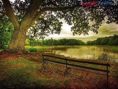 Lasy, Jesień, Jezioro, Ławka, Drzewa
