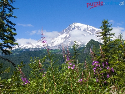 Puzzle Lasy, Góry, Chmury, Rośliny
