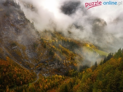 Lasy, Mgła, Droga, Jesień, Góry, Drzewa