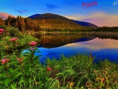 Puzzle Lasy, Jezioro, Góry, Kwiaty