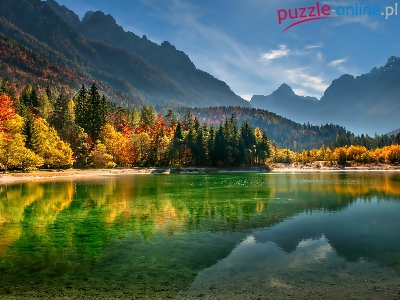 Lasy, Słowenia, Jezioro, Góry, Jesień