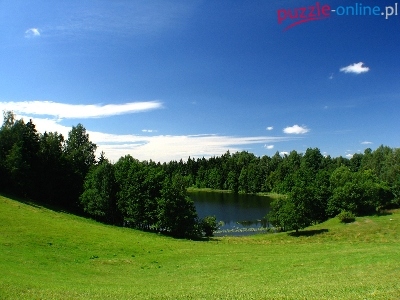 Puzzle Łąka, Jezioro, Lasy, Chmury